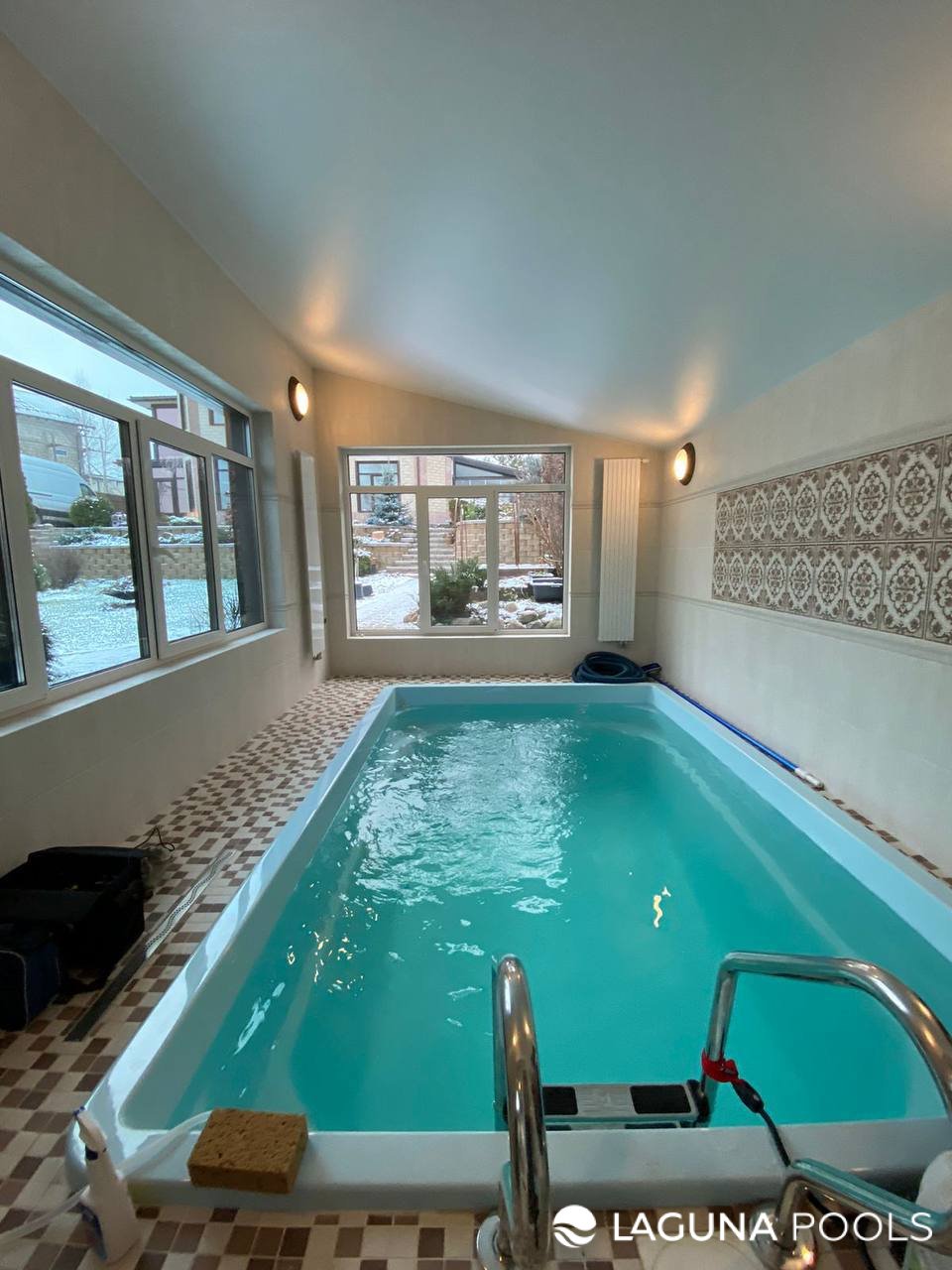 Прямоугольный бассейн с бирюзовой водой в помещении с узорчатой плиткой и зимним видом из окон.