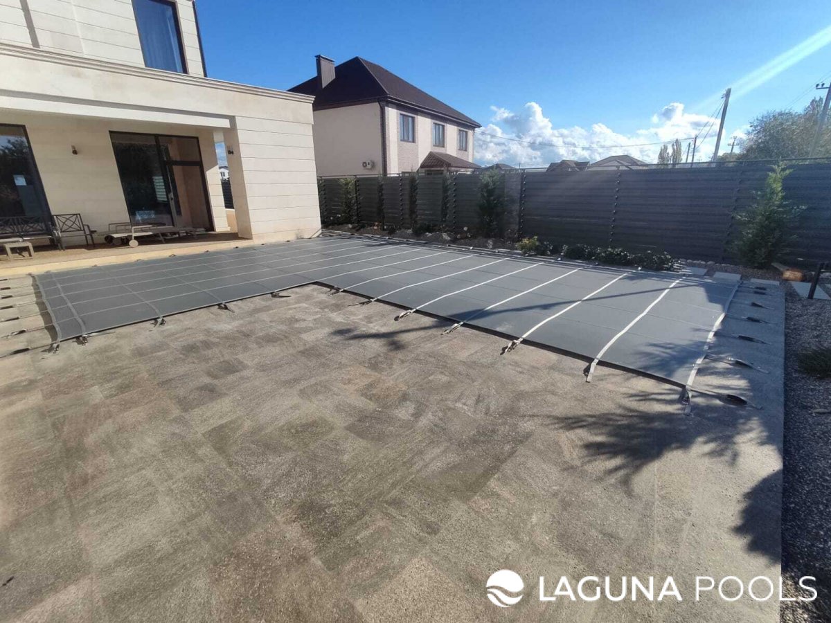 Бассейн с темно-серым защитным покрытием на площадке с крупной плиткой и огороженный высоким забором.